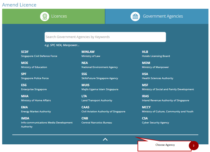Step 3: Select the ‘Licence’ available for amendment under the agency and click ‘Next’.