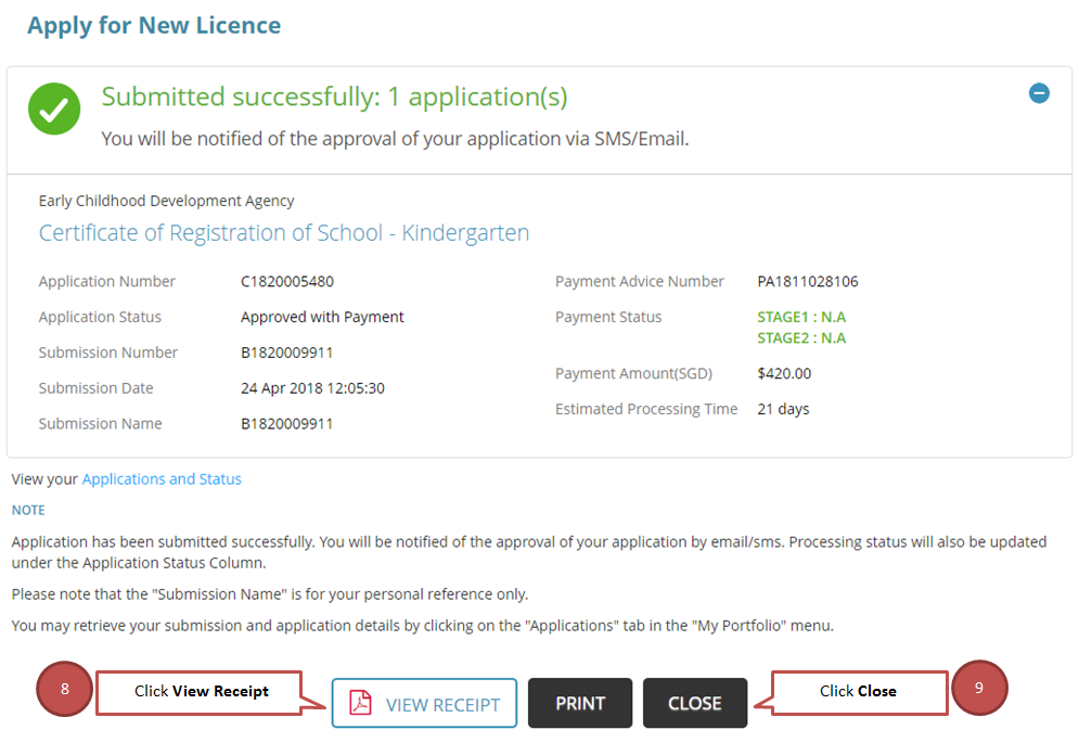 Step 4: Upon successful online payment, you will receive the acknowledgement in GoBusiness Licensing. Click on ‘View Receipt’ to print your receipt and click on ‘Close’ to close the acknowledgement page.