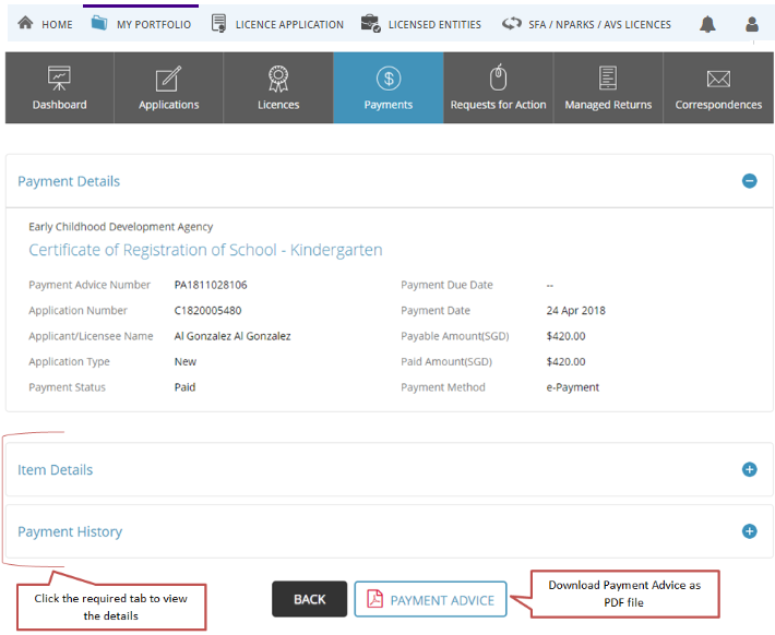 User can search and manage their payment advices in this module. Payment advices refer to payments issued for licence applications, renewal fees etc. User can search for ‘paid’ or ‘unpaid’ payment advice using this module.